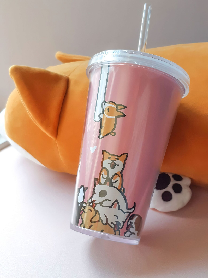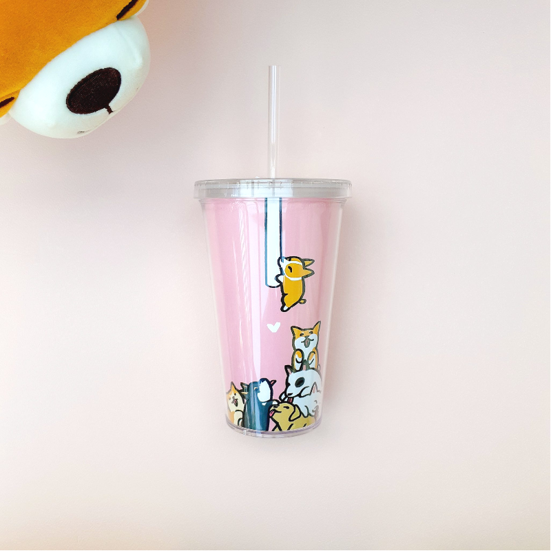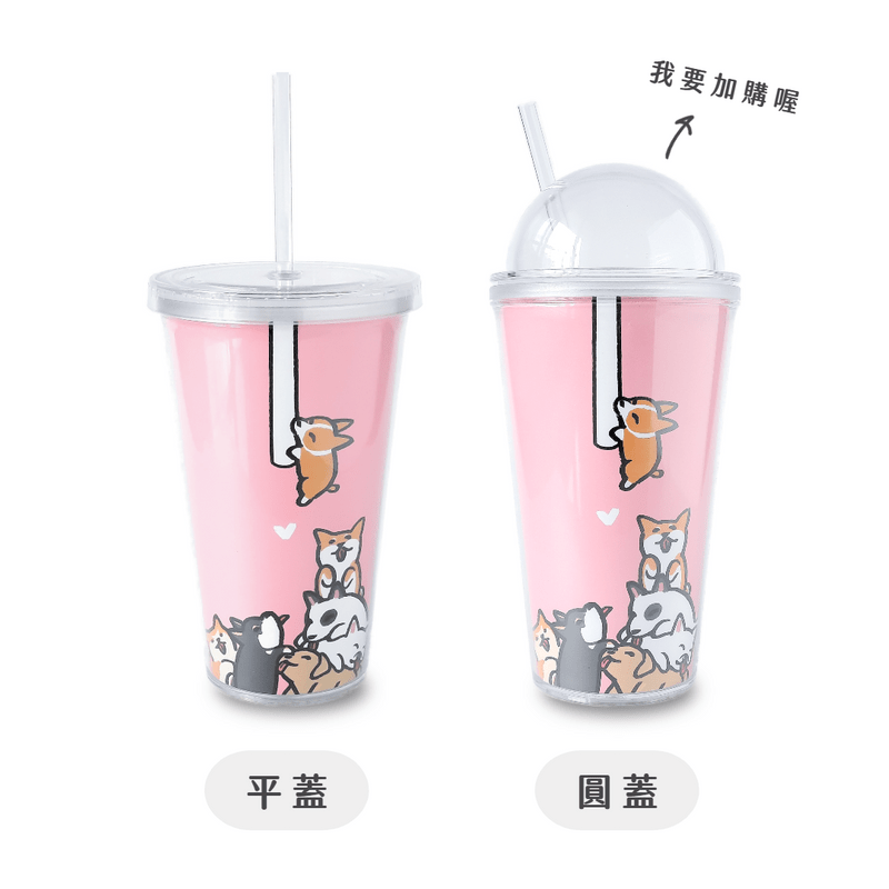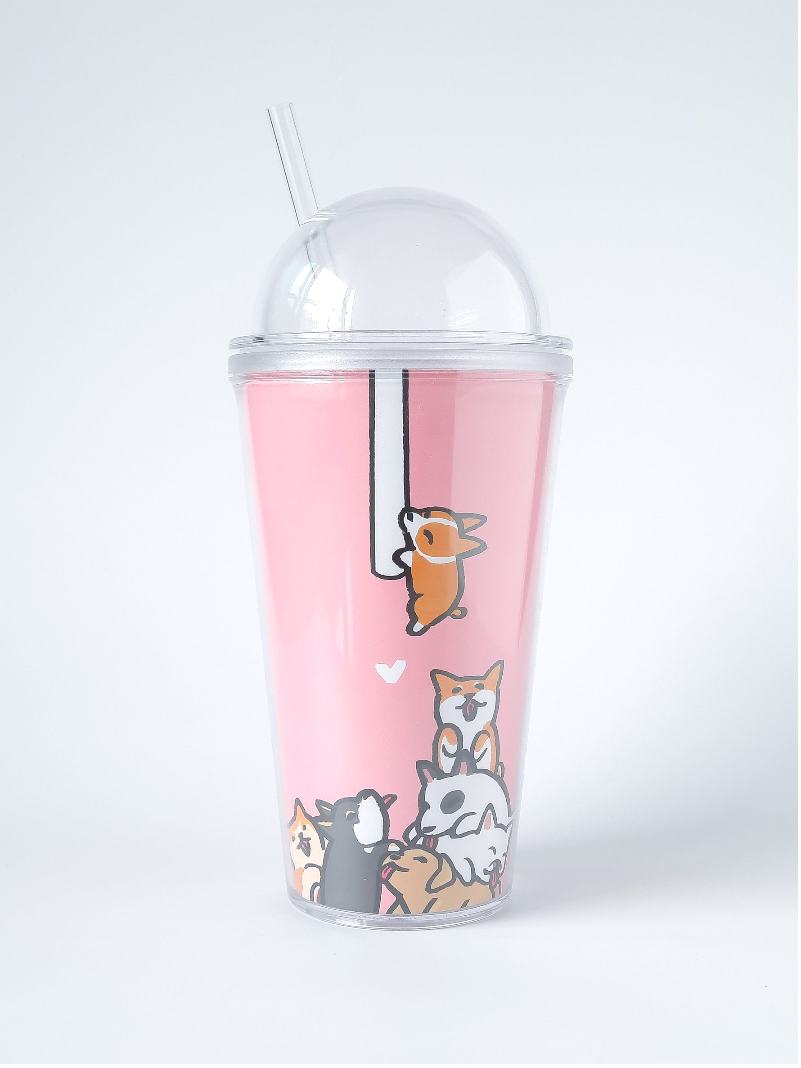 可愛動物雙層吸管冷水杯 500ml - 狗狗